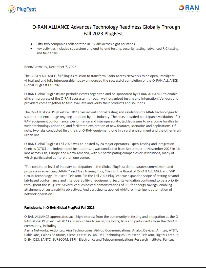 Open RAN PlugFest Fall 2023 at i14y Lab