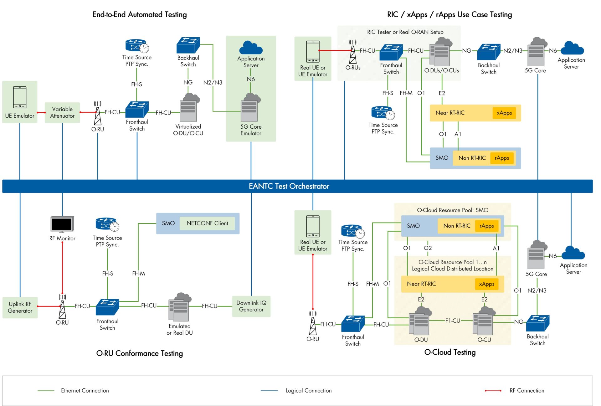 Die O-RAN-Spezifikationen ermöglichen es, Komponenten verschiedener Hersteller frei zu kombinieren. Während diese Flexibilität die Interoperabilität fördert, erhöht sie zugleich die Komplexität bei Integration und Betrieb. Umfassende Vortests sind daher unerlässlich. Der EANTC Test Orchestrator unterstützt die folgenden Bereiche des O-RAN-Testings:
