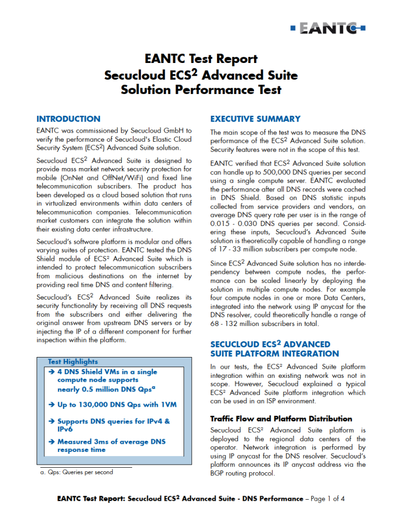 EANTC verified that the ECS2 Advanced Suite solution can handle up to 500,000 DNS queries per second using a single compute server. We evaluated the performance after all DNS records were cached in DNS Shield. Based on current statistics, the solution is theoretically capable of handling a range of 17 – 33 million subscribers per compute node.
